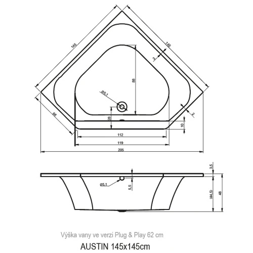 Чешские ванны RIHO известны во всем мире своей практичностью и долговечностью. Угловая акриловая ванна Austin 145x145 - практична и надежна, с продуманной формой и оптимальной глубиной. Чаша выполнена из высококачественного английского акрила Lucite, который отличается износостойкостью и прочностью, устойчивостью к царапинам и бытовым химическим средствам. Акрил хорошо сохраняет температуру воды, не шумит и легко очищается от загрязнений.