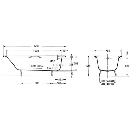 Чугунная ванна Jacob Delafon Diapason 170x75 E2926 с отверстиями для ручек