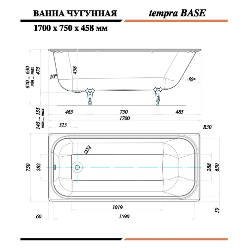 Чугунная ванна Tempra Base 170x75 круглые ручки