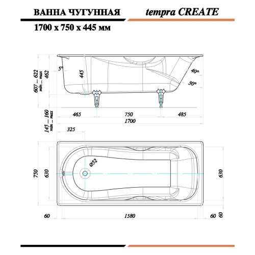Чугунная ванна Tempra Create 170x75 круглые ручки