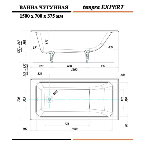 Чугунная ванна Tempra Expert 150x70 круглые ручки