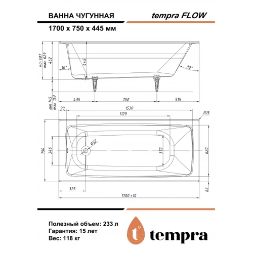 Чугунная ванна Tempra Flow 170x75. Чугунная ванна не деформируется, не трескается от перепадов температур, если не подвергать эмаль воздействию тяжёлых и острых предметов, она сохраняет свой внешний вид в течение длительного времени. Чугун хорошо хранит тепло, поэтому набранная вода дольше остаётся горячей.