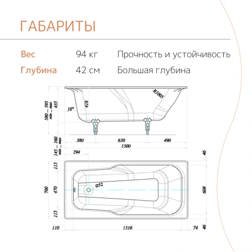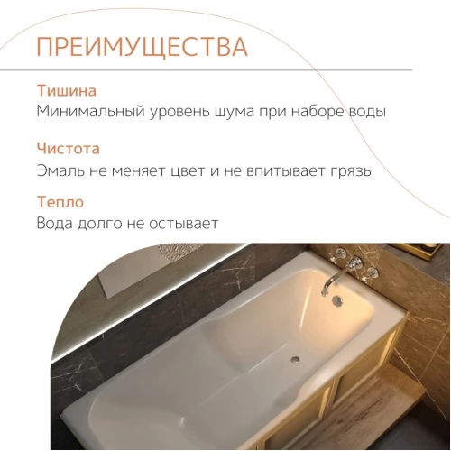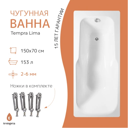 Чугунная ванна Tempra Lima 150x70. У ванн Tempra серии Classic гарантия 15 лет, что подтверждает ее надежность и долговечность. Вы можете быть уверены, что эта ванна прослужит вам долгие годы.Чугунная ванна не деформируется, не трескается от перепадов температур, если не подвергать эмаль воздействию тяжёлых и острых предметов, она сохраняет свой внешний вид в течение длительного времени. Чугун хорошо хранит тепло, поэтому набранная вода дольше остаётся горячей.