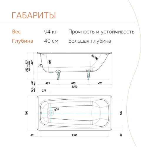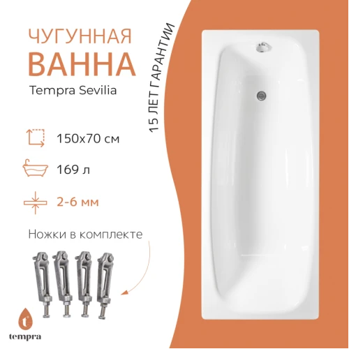 Чугунная ванна Tempra Sevilia 150x70. У ванн Tempra серии Classic гарантия 15 лет, что подтверждает ее надежность и долговечность. Вы можете быть уверены, что эта ванна прослужит вам долгие годы.Чугунная ванна не деформируется, не трескается от перепадов температур, если не подвергать эмаль воздействию тяжёлых и острых предметов, она сохраняет свой внешний вид в течение длительного времени. Чугун хорошо хранит тепло, поэтому набранная вода дольше остаётся горячей.