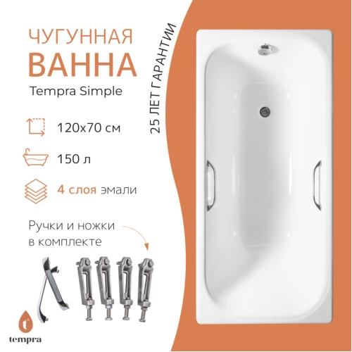 Чугунная ванна Tempra Simple 120x70 квадратные ручки. Прочность и долговечность - в этом плане чугунная ванна безусловный лидер. Ванны Tempra покрыты в несколько слоев высококачественной титановой эмалью, благодаря чему сохраняют свой внешний вид в течение длительного времени.