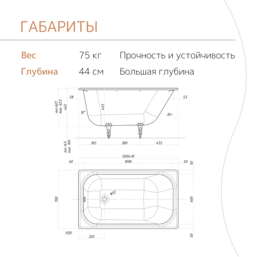 - вес ванны: 75 кг