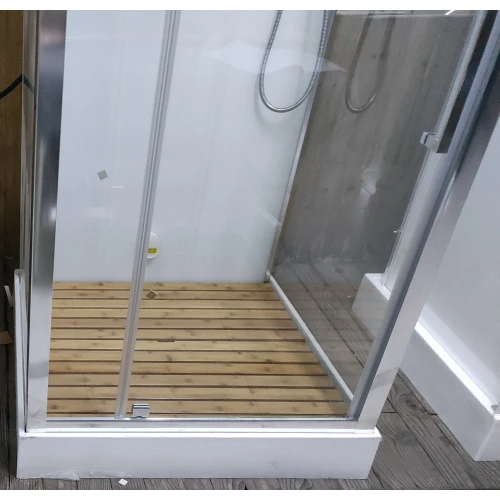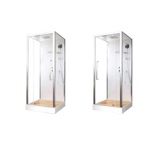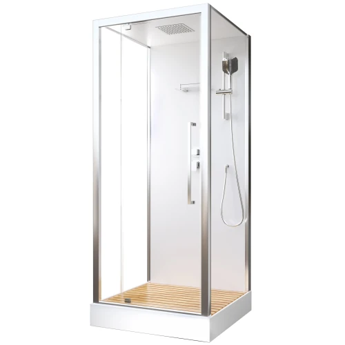 Качественная немецкая душевая кабина Acquazzone Nikita 100SL 100х100 с низким акриловым усиленным поддоном и стеклянной крышей. Удобная распашная дверь, прочное стекло толщиной 6 мм, стильный деревянный настил на пол. Минималистичный дизайн в скандинавском стиле - полированная сталь и прозрачное стекло!