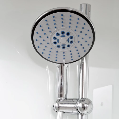 - Душевая штанга с регулировкой лейки по высоте и ручная лейка с силиконовыми форсунками диаметром 140 мм с функцией переключения режимов.