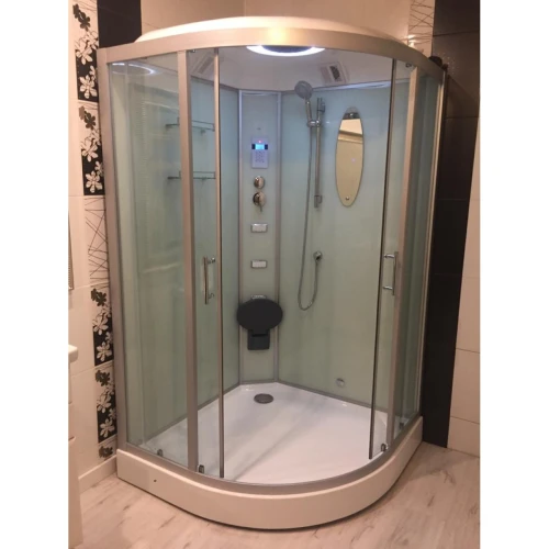 Душевая кабина Frank F602-1 угловая. Кабина изготовлена из высококачественных материалов, таких как: санитарно-технический акрил, высокопрочный алюминий и закаленные ударопрочные стекла, толщиной 6 мм. Плавность хода дверей гарантируют, 8 двойных металлических роликов, а их равномерное примыкание к друг другу - вертикальные магнитные уплотнители. Поддон кабины усилен металлическим каркасом на регулируемых опорах и выдерживает нагрузку до 300 кг. На стенках и центральной стойке, расположились: переключатель и смеситель с керамическим картриджем, сенсерный пульт управления, ручная лейка с самоочищающимися резиновыми джетами, три форсунки гидромассажа, зеркало, сидение в поддоне и просторная полочка для шампуней и гелей. А на крыше, нашел себе место, широкий тропический душ, диодная лампа, вентилятор и динамик под FM радио.