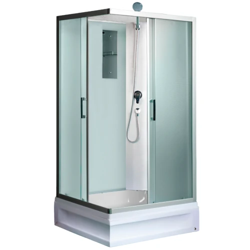 Комплектация: ручной душ, смеситель, полочка, зеркало, ролики двойные регулируемые, сифон с гидрозатвором.