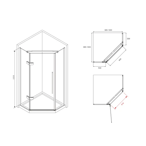 Распашная дверь при открывании создает широкий, удобный для входа проем. Душевой уголок предназначен для установки на пол или поддон.