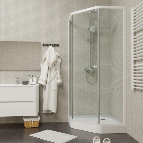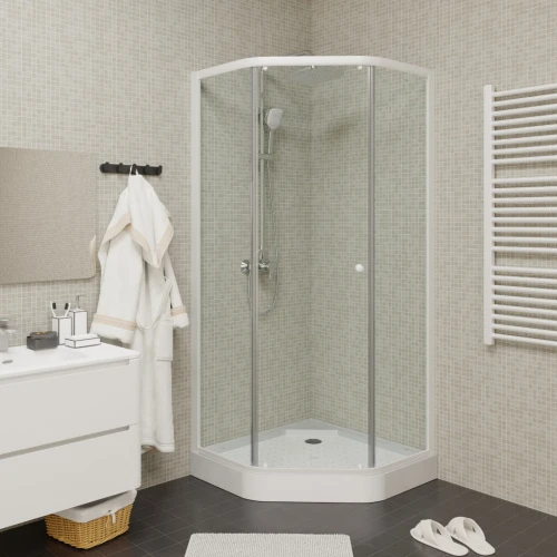 Белый профиль и прозрачное стекло придают уголку визуальную невесомость. Благодаря универсальному дизайну, уголок не будет перетягивать на себя внимание от общей идеи оформления ванной. За счет трапециевидной формы модель занимает мало места, но внутри комфортно принимать душ.