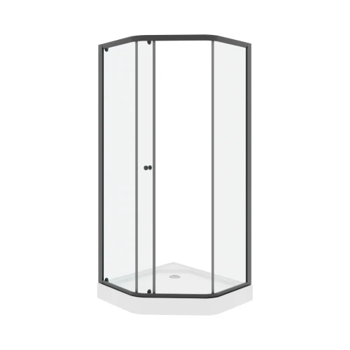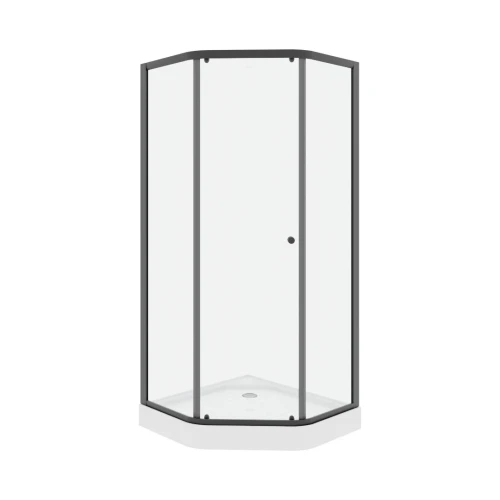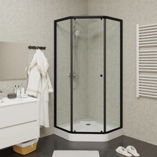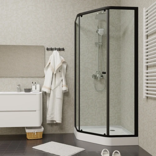Черный профиль и прозрачное стекло придают уголку визуальную невесомость. Благодаря универсальному дизайну, уголок не будет перетягивать на себя внимание от общей идеи оформления ванной. За счет трапециевидной формы модель занимает мало места, но внутри комфортно принимать душ.