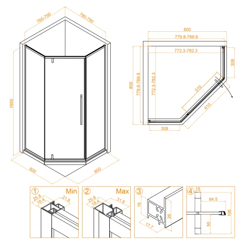 Основное преимущество данного душевого уголка – это его толщина стекла 6 мм, что обеспечивает высокую прочность и долговечность конструкции. Размеры душевого уголка – трапеция, его высота составляет 1950 мм, что позволяет легко поместиться внутри. Материал профиля – анодированный алюминий в черном цвете, что гармонично подчеркивает дизайн и придает углуоку роскошный внешний вид.