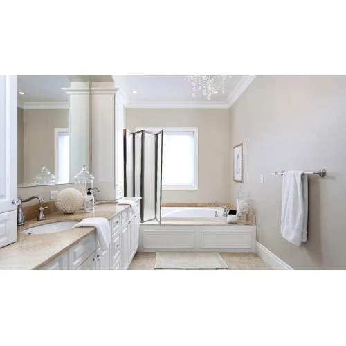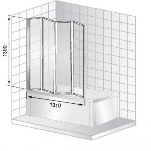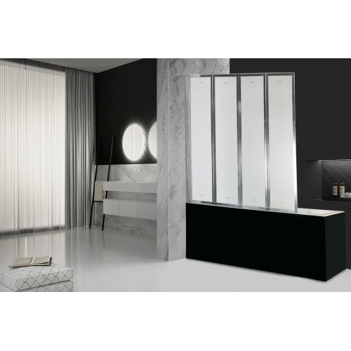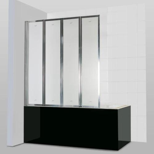 - Складная шторка из 4-х частей удобно складывается над ванной. Вода, стекая со стекла, попадает в ванну, оставляя пол сухим.