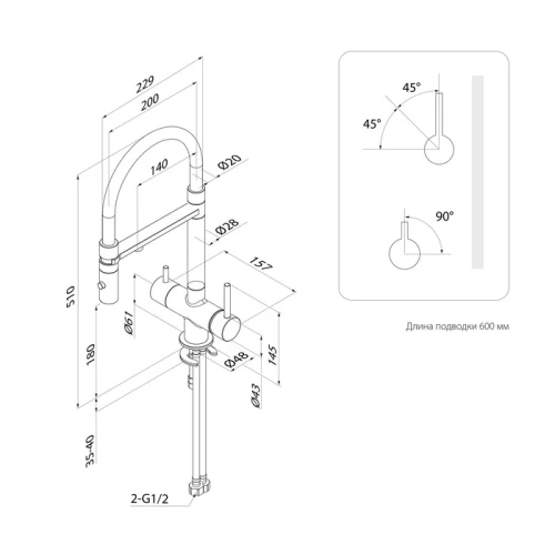 2 ручки: для включения фильтрованной воды и обычной водопроводной (угол открывания ручки – 90 градусов, на себя; может отличаться в зависимости от партии). Фильтр в комплекте не идет и приобретается отдельно.