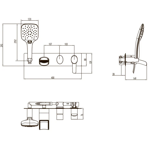 Аксессуары в комплекте: растяжной шланг 1,5-2 м с функцией вращения лейки без перекручивания (Turn-Free), 3-функциональная лейка 120x252 мм