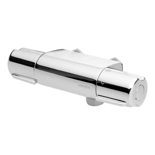 Термостат для душа Swedbe Mercury — надёжный смеситель от шведского бренда Swedbe. Оснащён «умным» картриджем. Благодаря обратным клапанам решается проблема «выдавливания» холодной воды горячей из-за разницы давления, когда температуру воды отрегулировать невозможно. Клапаны чётко разделяют холодную и горячую воду, исключая подмес. Это важно в тех домах, где есть сильная разница давления в стояках. В моделе предусмотрен ограничитель температуры, предустановленный на отметке 38 градусов, что считается идеальным значением для комфортного мытья. Можно не бояться обжечься при повороте рукоятки температуры, что актуально для семей с маленькими детьми.