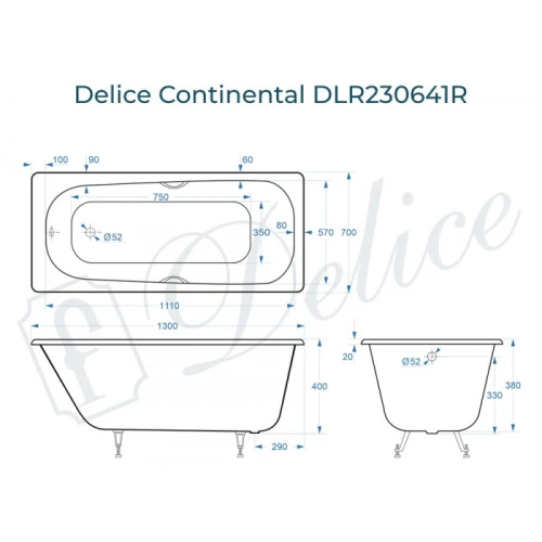 Ванна чугунная Delice Continental 130х70 с отверстиями под ручки DLR230641R