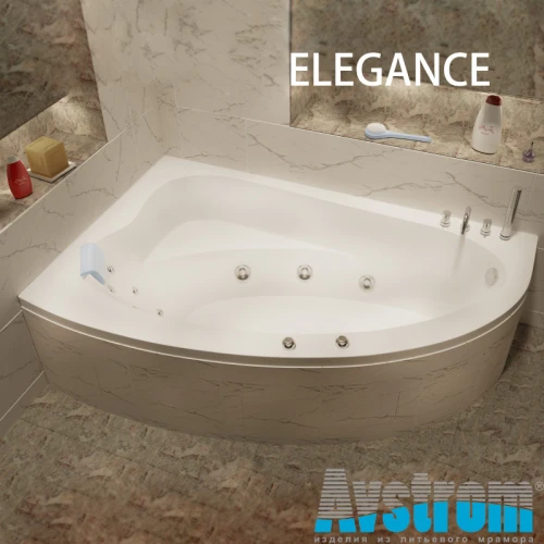 Ванна из литьевого мрамора Avstrom Elegance 150x100 - отличный угловой вариант, если Вы мечтаете о комфортных процедурах. Благодаря угловому расположению ванна очень комфортна по размеру, но при этом экономит пространство санузла. Изготавливается как в левом, так и в правом вариантах установки, может комплектоваться разнообразным гидро- и аэромассажным оборудованием, боковым экраном на большой выбор: из дерева или мозаики.